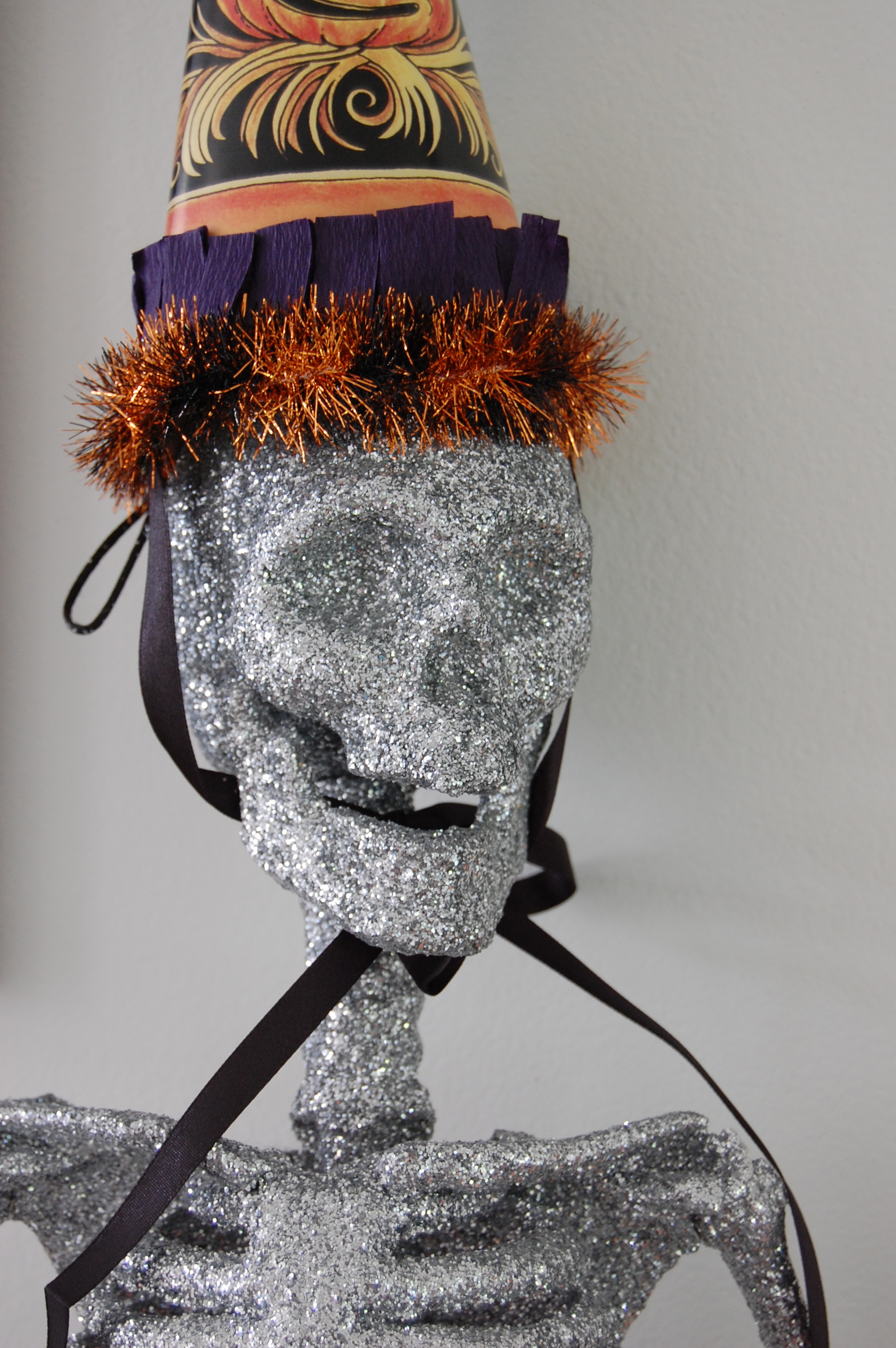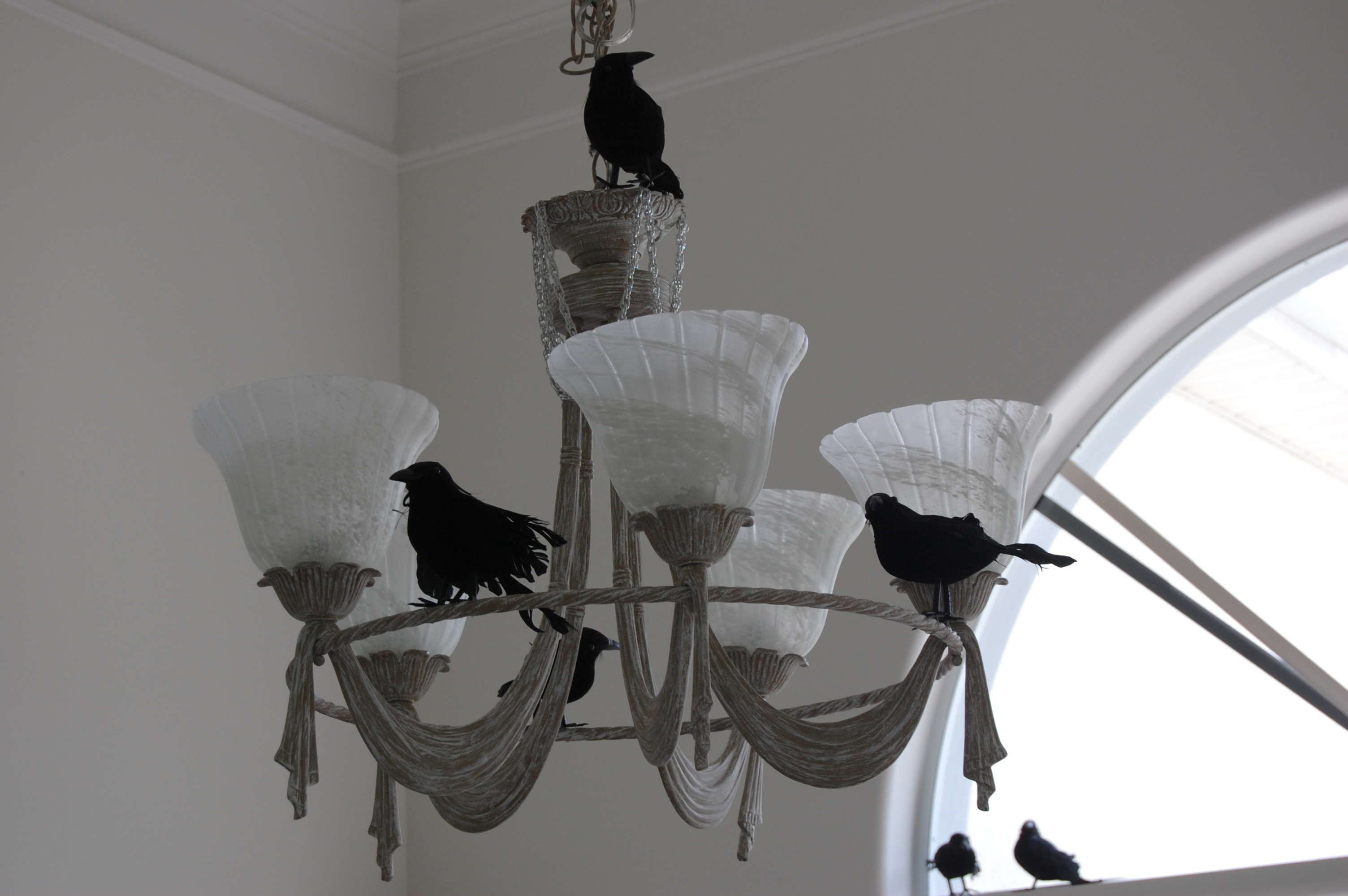 Pay a visit to the Dollar Store. It’s amazing what comes through there. We now have a flock–about 30 or so–in residence that were purchased there. (Can you say nevermore?) I feel like I should put down newspaper or something for them… Yesterday, I also found tiny glittered skulls (worth buying and not doing yourself) and mesh cloth that is perfect for draping over furniture pieces for an eerie look. And all for a dollar a piece!