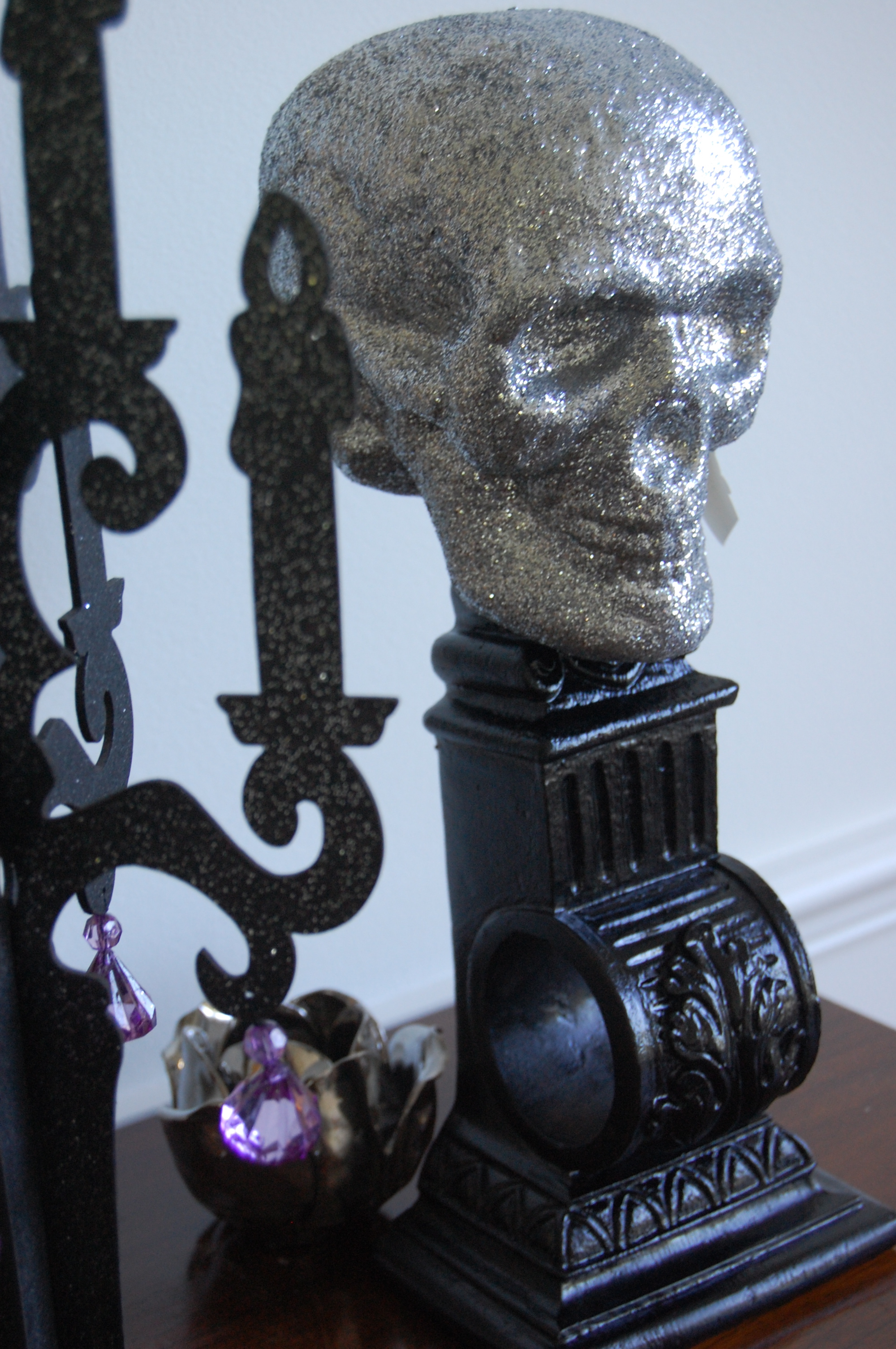 Never underestimate the power of a couple of cans of black spray paint. I had a variety of thrift store finds I spookied up with a little black paint to make them part of our haunted manor decor. This particular item (that the glittery skull is resting on) was a curtain sconce. It will soon be a shelf on the wall, but I like it just how it is as well.