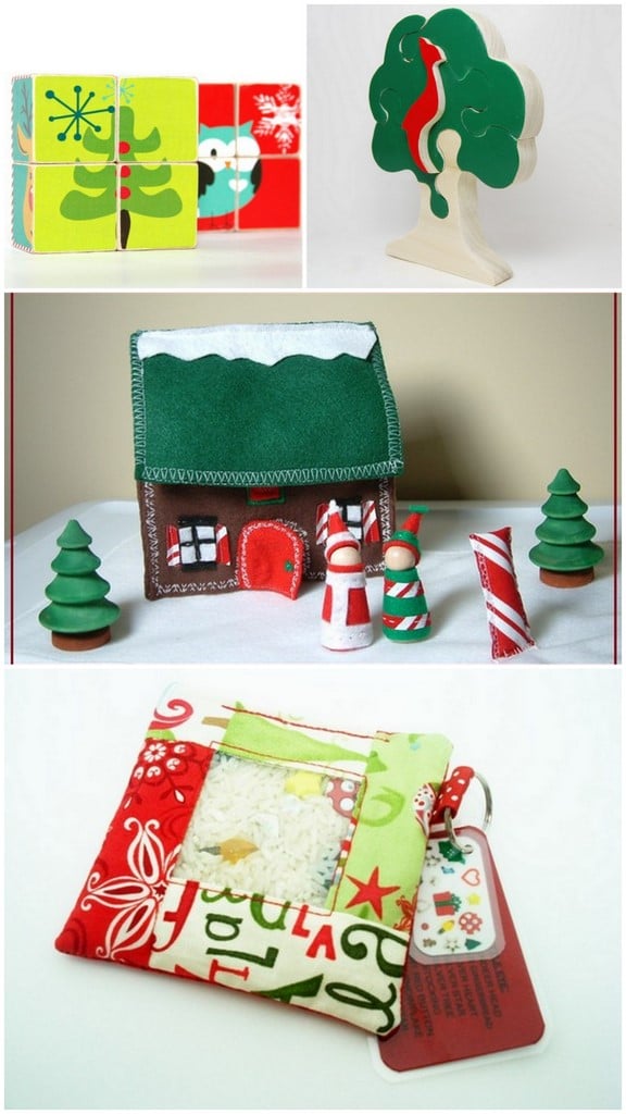 Shopping for Christmas is in full swing! I asked Courtney, my in house children’s product specialist, to put together a handmade gift list for little ones, and she made some really spectacular finds. There are lots of really neat toys available by Etsy artisans that are great alternatives to store-bought toys. This first group have a christmas theme; I’m especially in love with the little hand-held “I spy with my little eye” game, which also comes in non-holiday patterns.