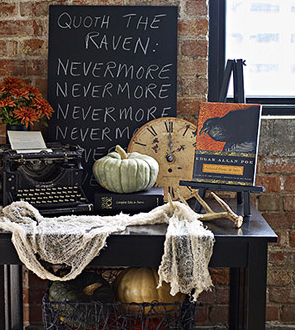 As one of those crazy people who scoops up all the special edition Halloween magazines every year and pours for hours over every one, I can tell you this was probably the most creative mock-party (by Better Homes and Gardens) I saw in all the glossy pages I thumbed through. Perhaps it’s because we are living with our very own flock of ravens in our front rooms this Halloween or due to my love of a party with smart literary references that I love this one so much. The smallest details were attended to and it provided lots of ideas to {ahem} borrow.