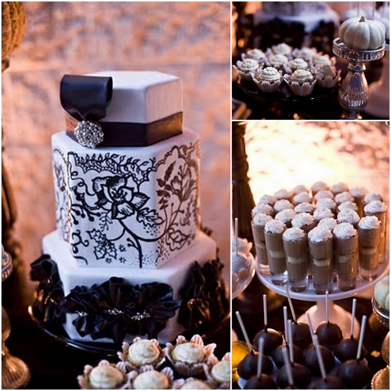 A stylishly dark party, a little gothic, a little victorian, was thrown in Beverly Hills last year by JL Designs (found via the Entertain Exchange) with a Very Vintage Halloween theme. The whole staged area comprised of thrifted pieces in lifeless colors that were paired with flowers to make for a perfect eerie halloween setting. The dessert table was done in muted colors, but created a stunning effect. The lighting of the table looks as big a part of the design as the individual desserts, pumpkins and candlesticks on the table. Delightfully spooky!