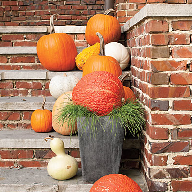 So onto the decorating! There are many simple things you can do to create a festive air for the front of your home. Collections of pumpkins, mums, and a few well placed ribbons can make an impact. Of course, a darling wreath never hurts! Southern Living has at tutorial on how to make this beautiful wreath out of miniature pumpkins.