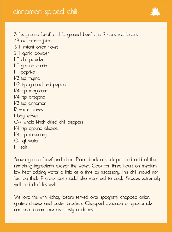 On Saturday, we’re inviting a few little friends over for some food and pumpkin fun while we pretend we’re back where there might be a crisp fall day and some colorful leaves. Parties don’t have to be big formal fancy affairs; sometimes it’s nice just to be simple with one or two special touches. I plan to put out enough pumpkin carving tools so everyone has something to dig into their pumpkin with, serve up some cinnamon spiced chili and cornbread, and top everyone off with some apple cider, adult beverages and have a few marshmallow pumpkin cookies with milk for dessert. It will be a nice informal way to pass the afternoon with some good friends! Here are the recipes for our little menu: