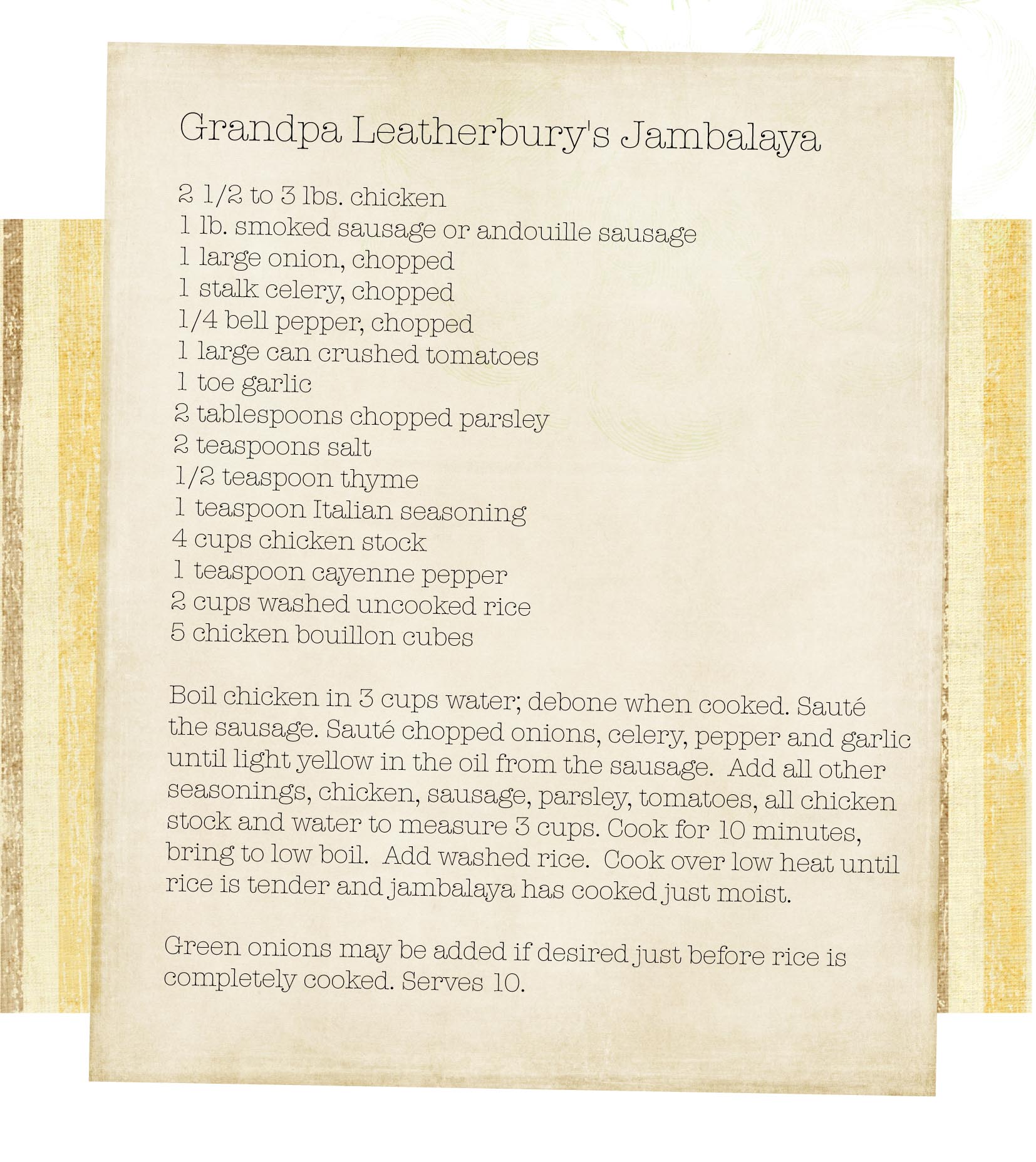Notes: The original recipe for this dish originated with my Grandpa Leatherbury when he used to make it for 40+ people at local festivals in Lacombe, Louisiana. The key to a truly excellent Jambalaya is the stock—and we always make our own. Make poultry stock by boiling chicken or turkey bones with a bit of onion and celery for an hour or so. We often substitute a cup of the chicken stock with ham stock made from boiled ham hocks to add a deeper, more complex flavor to the jambalaya.