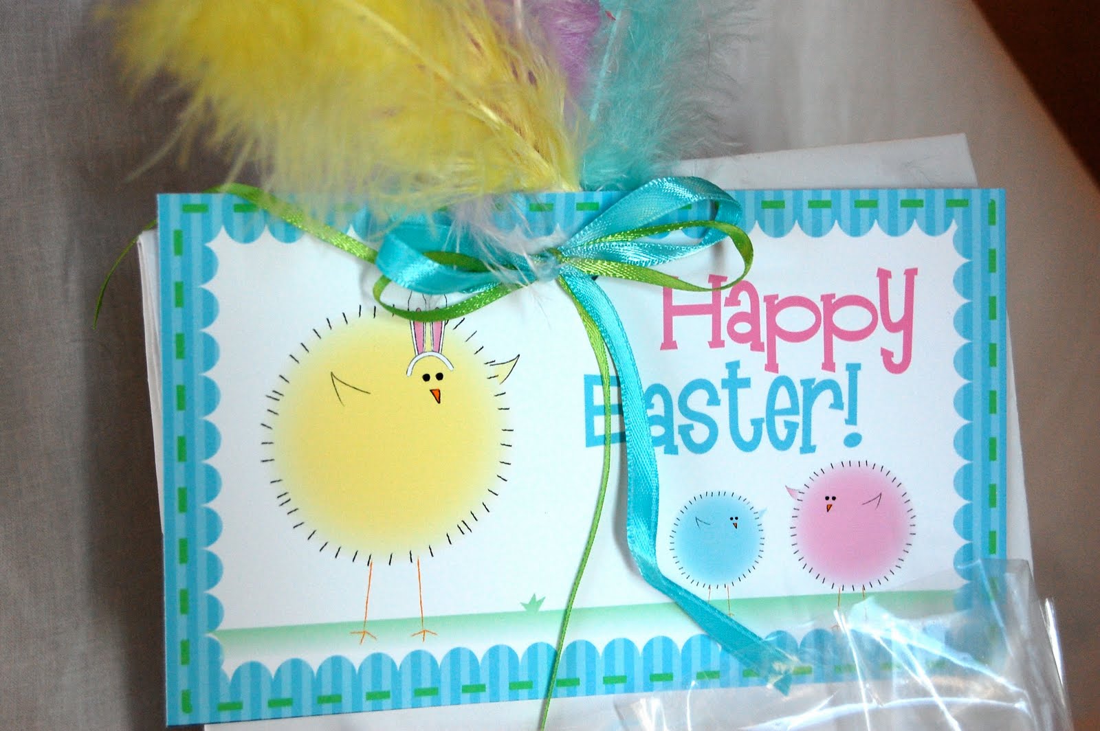 The kids made Easter baskets in class this year, so I opted for a snazzied up paper bag. I couldn’t resist the feathers.