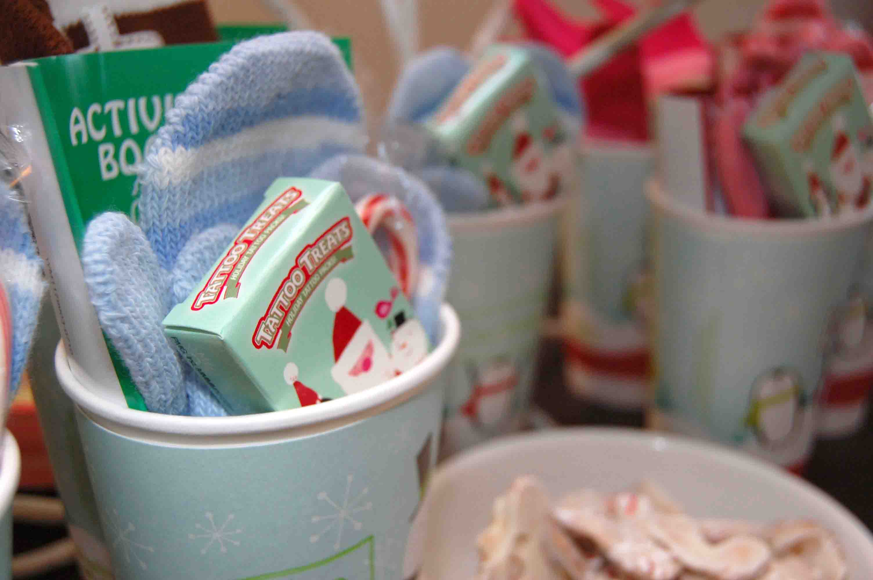 And to go along with her “hot chocolate” theme, she had little Christmas gifts for all the kids who came. The cups were used for hot chocolate during our Christmas light stroll, and the little mittens meant to keep little hands warm while we were out in the cold — cold for Florida, that is! A single candy cane was in the cups (and we thank her for the lack of candy) and some other Christmas-themed activities. Her favor bags are always so thoughtful!