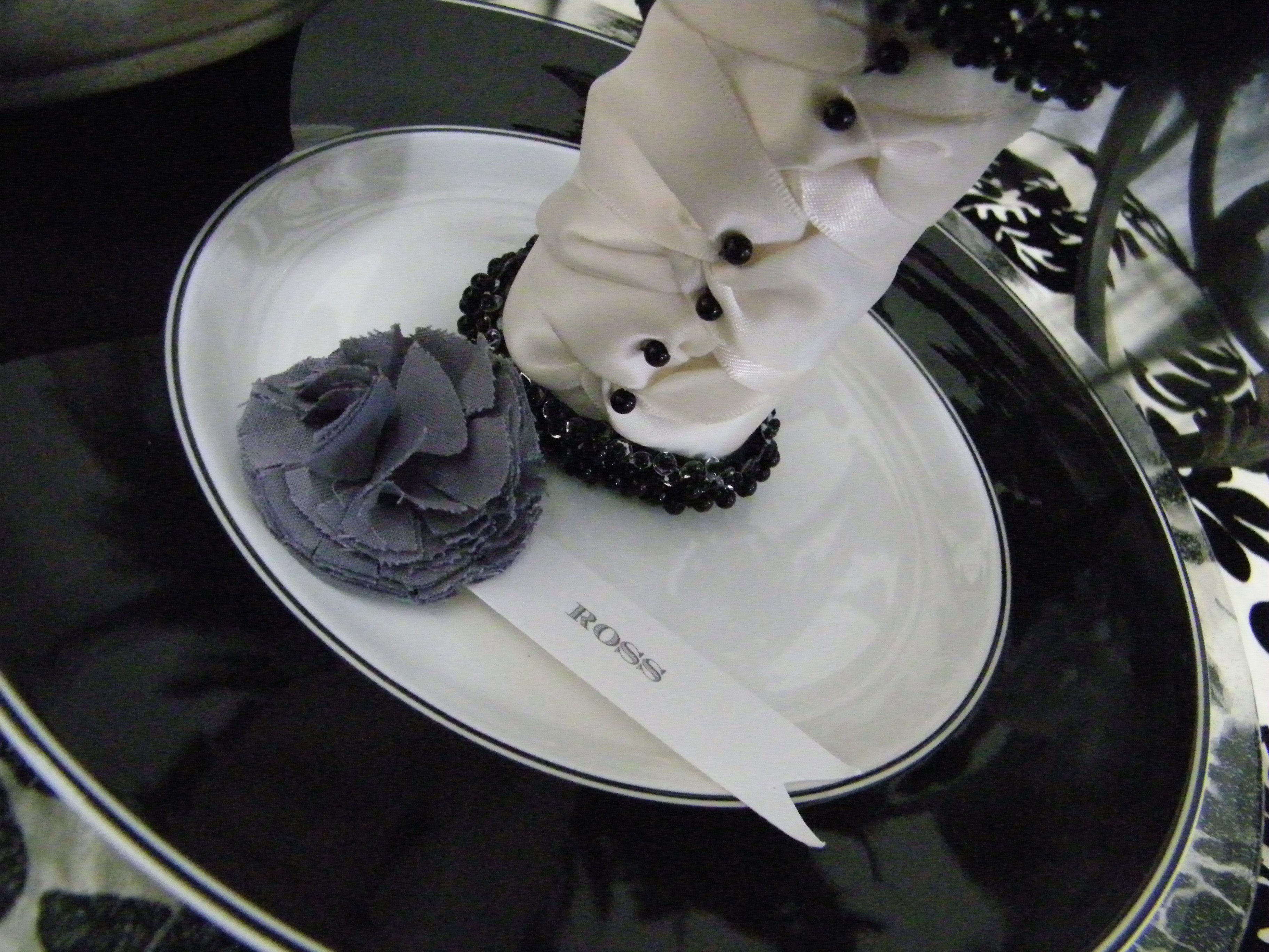 Natalie used a backdrop of black and white damask and blended in lots of fun elements like feathers, mercury glass, clocks and wrought iron. I just love the place settings she created with the truffle favor boxes, and the black velvet paper party crackers!