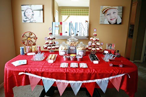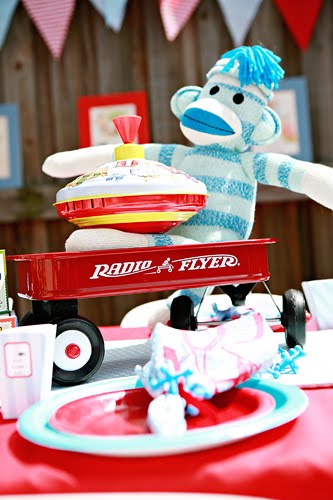 The sock monkey in a radio-flyer wagon and building blocks gave the table great height and interesting focal points. Each place setting was carefully designed with matching plates and little snack cups filled with cotton candy.