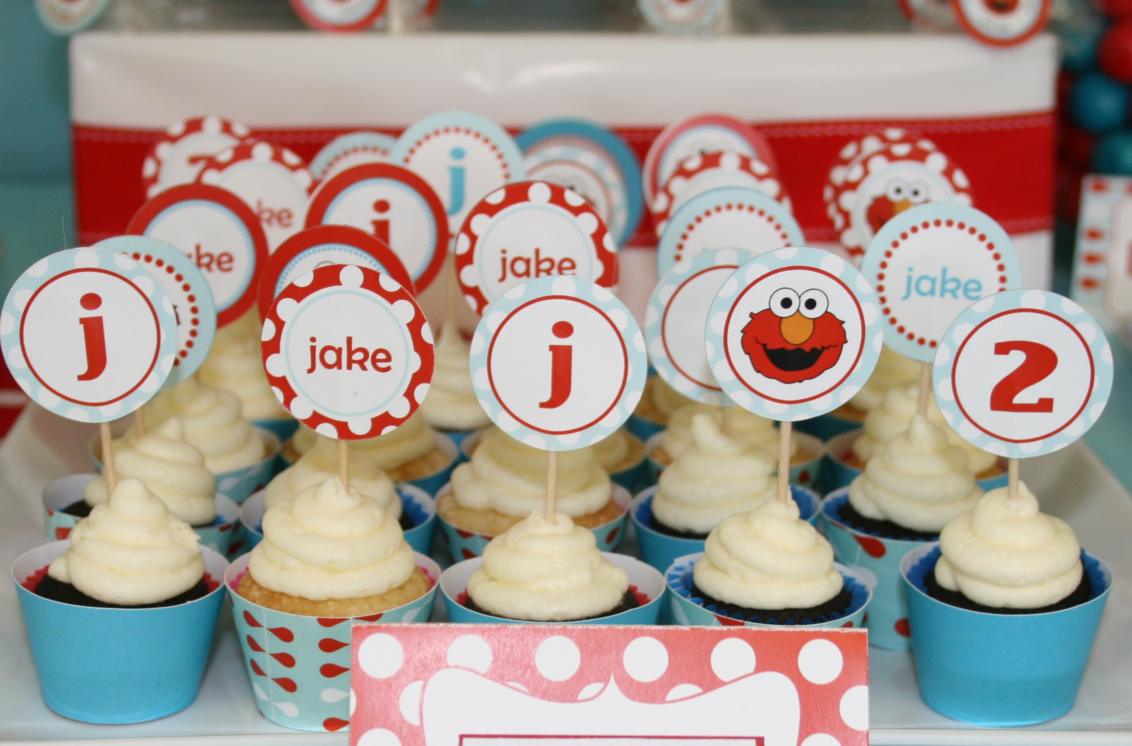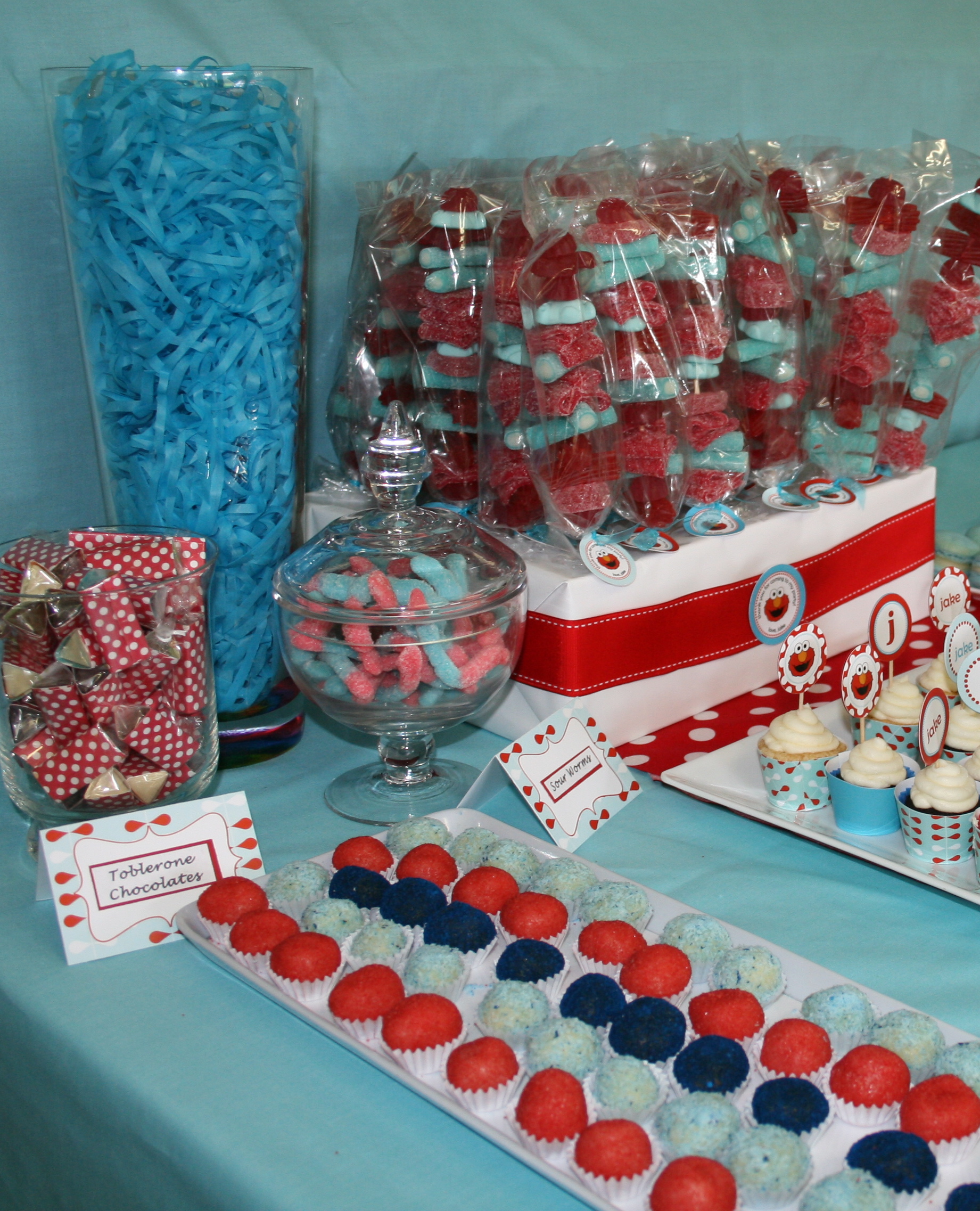 Such an incredible amount of detail work went into this dessert table–from oreo truffles shaped like Elmo to the beautifully done candy skewers and macarons in perfect matching shades of red and aqua.