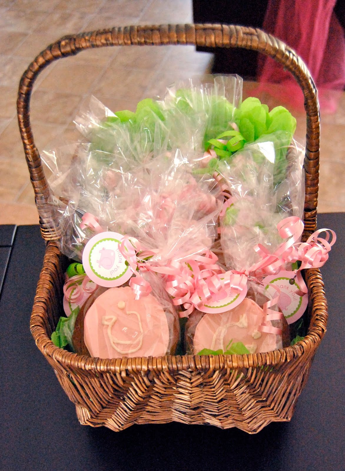 For party favors, I made chocolate sugar cookies with a big “C” monogram for the baby’s name, Caroline. They were tied off with a little “thank you” party circle.