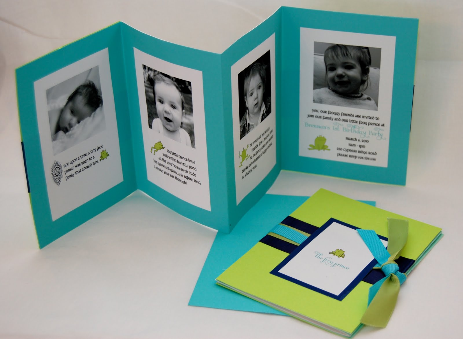 The frog prince colors I chose are apple green and tiffany blue (royal, don’tcha think?). Each panel shows Bubby growing up over the year – at 1, 4, 7, and 11 months. We had a lot of fun taking his picture every month this year! The frogs I hand drew then scanned in and spent some time making them into vector illustrations. The invitations are tied closed with three separate ribbons and a label placed on top to give it a storybook feel.