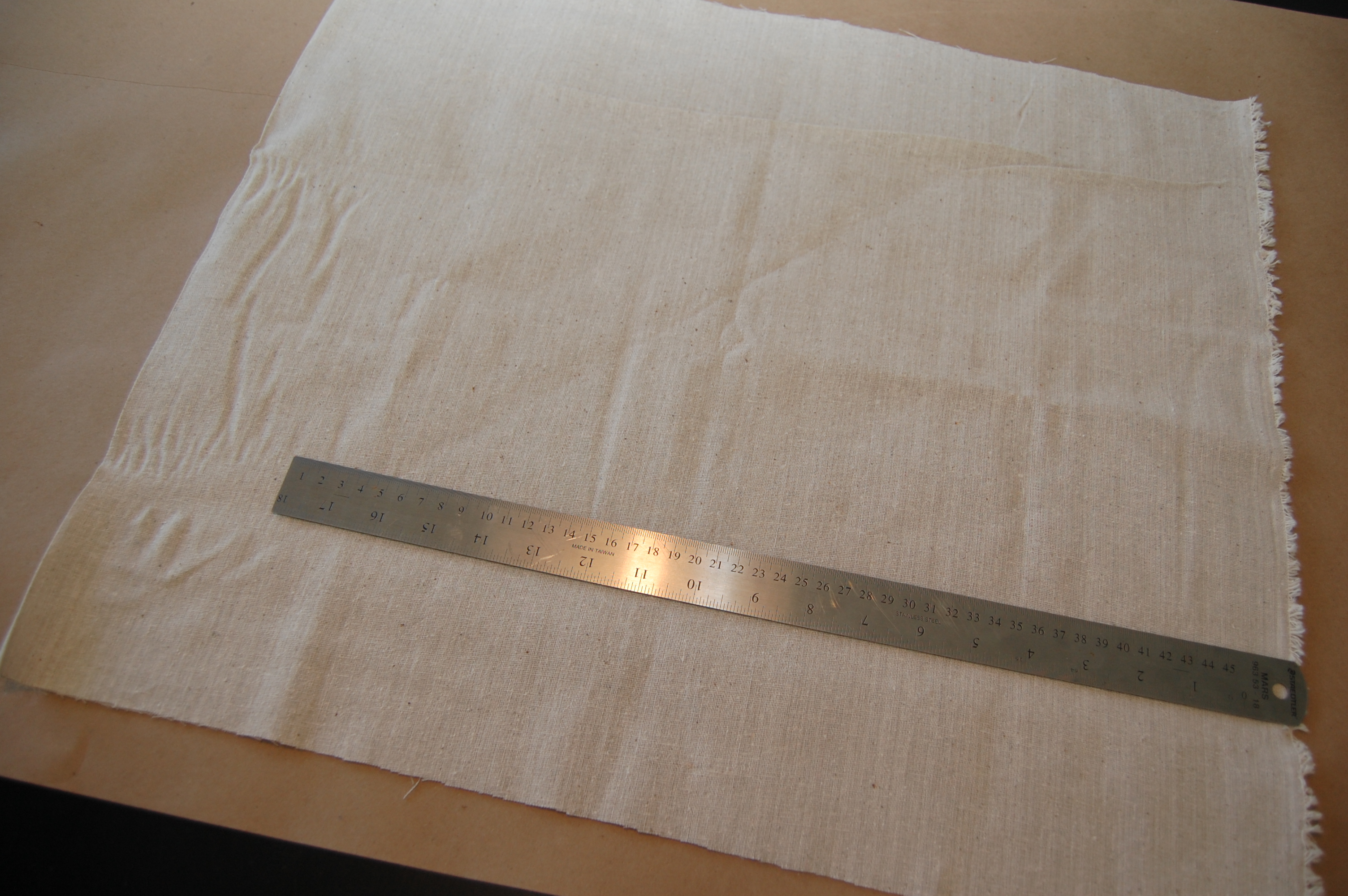 18 inches by 18 inches is a pretty standard size for napkins, so 1/2 yard of material should provide two napkins with a bit of material leftover. Using a ruler, measure a 19 inch square, making sure to mark exactly along the woven threads of the fabric; this will be important once the fringe is started.