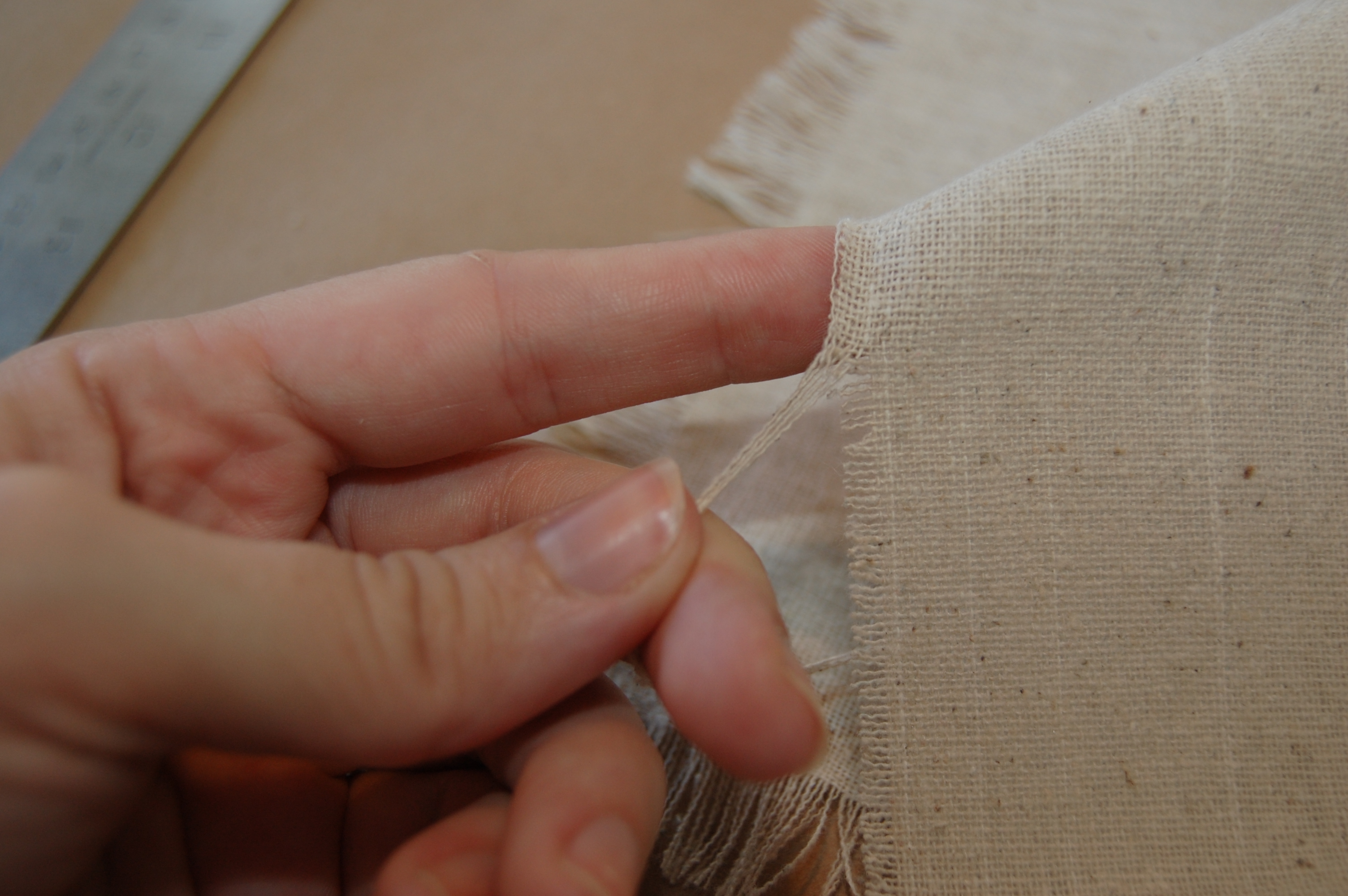 Once the squares are cut, start unravelling the material on all four sides by 1/2 to 3/4 inches. Just gently pull out a thread or two along the edge at a time until the fringes are at an appealing length. You’ll really notice it after a few pulls if your cut was uneven. If it was, just scissor up the sides to make them perfect. I left mine un-reinforced, but if you like, you could run a seam around the edges of your napkins to prevent any further unraveling.