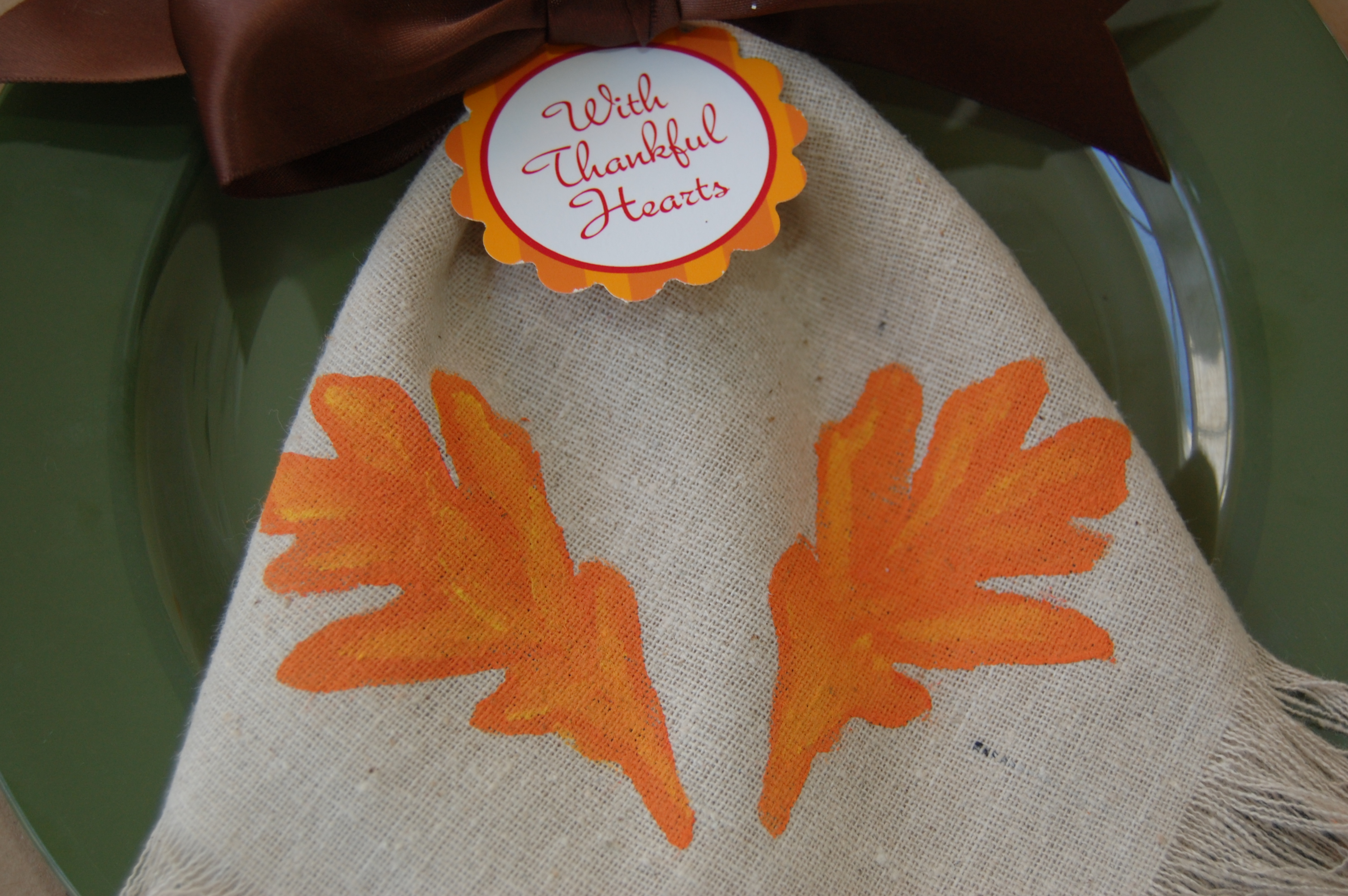 Place the template in a pleasing position on your napkin, and while holding it tightly down, dab your napkin with paint until your stencil is filled. My daughter loved this part, as she was able to do it without worrying about getting any paint where it didn’t belong! If you’re doing two leaves, wait for the first to dry before stenciling on the other.